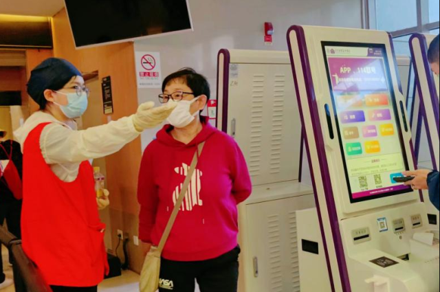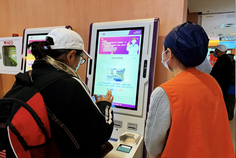 杜苡萱同学帮助患者顺利通过自助机完成费用支付(岗位:一层内科区域自助机)
