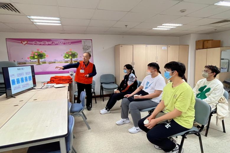 我院志工队骨干志愿者带领大学生来到服务现场进行岗位工作讲解