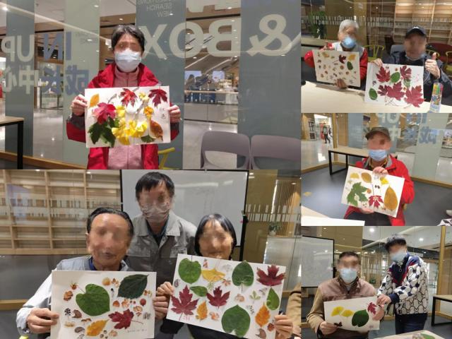 在“金风飒飒,黄叶夕红”环节,在社工的引导下,长者们运用平时散步搜集到的树叶进行贴画。完成作品后,每人也都和自己的作品合影,一位阿姨开心地表示:“完成之后我要拿回去给孙子看。”在热闹的欢笑声中,小组活动氛围被推向高潮。