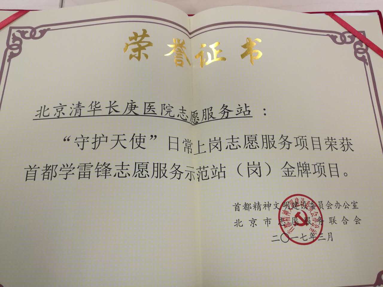 清华长庚医院4月25日电(医政组 张璠)为总结经验、激励先进、树立典型,完善志愿服激励机制,进一步增强志愿者的积极性和荣誉感,推动首都学雷锋志愿服务制度化发展,首都文明办、首都综治办、市委社工委、市民政局、团市委、市志愿服务联合会共同开展了第二批首都学雷锋志愿服务示范站(岗)金牌项目评选活动。我院作为第二批首都学雷锋志愿服务示范站之一,经北京市志愿者联合会推荐,清华长庚“守护天使”日常上岗志愿服务项目在数百家申报单位中脱颖而出,获评首都学雷锋志愿服务示范站金牌项目称号。