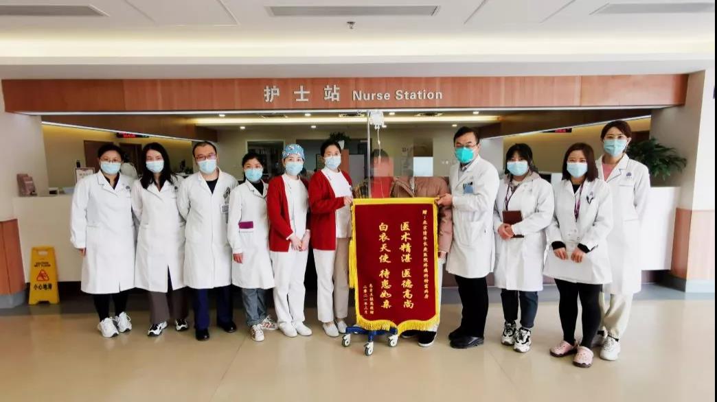 图5 医务社工(左一、左二、右一、右三)与医疗团队收到患者、家属赠送锦旗
