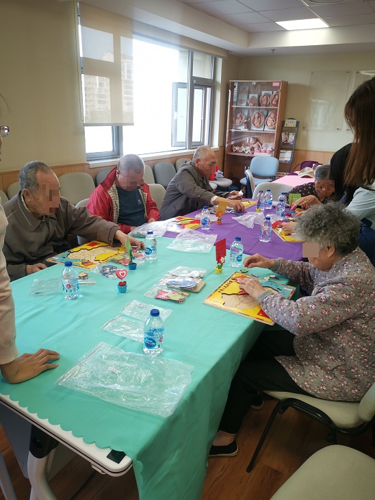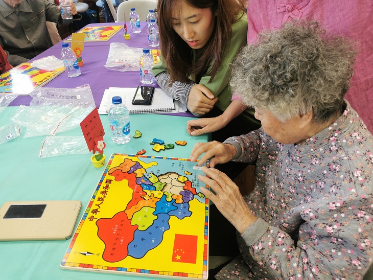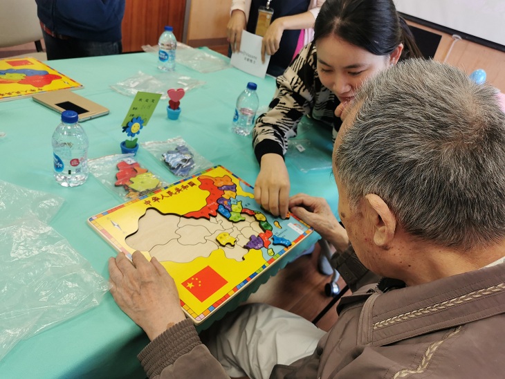 随后,社工带领大家一起回顾了全国各个省份的特色,并为每位老人分发了一份中国版图的拼图,社工带着老人按照形状和方位逐一补全拼图的空缺,用耐心细致的话语安抚焦虑,让老人沉浸在拼图的世界里、渐入佳境。