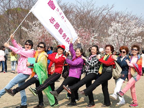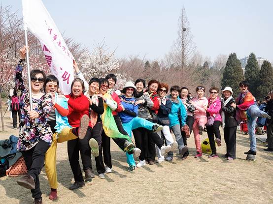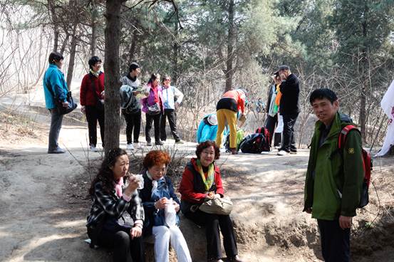 在这美景映衬的湖边花下,聚集了一群志愿者——北京清华长庚医院志愿服务队的朋友,欢声笑语不断,摆pose、照合影,旌旗舞动、笑声朗朗,引得围观不少,诺大的园林因这支队伍而更发春意盎然!午餐时,大家围坐山腰上的一块平地,铺上自己带来的塑料布垫,取出自带的食物饮料,也算是一次聚餐,餐后大家把垃圾全部带走,“除了脚印,不留一丝痕迹”!