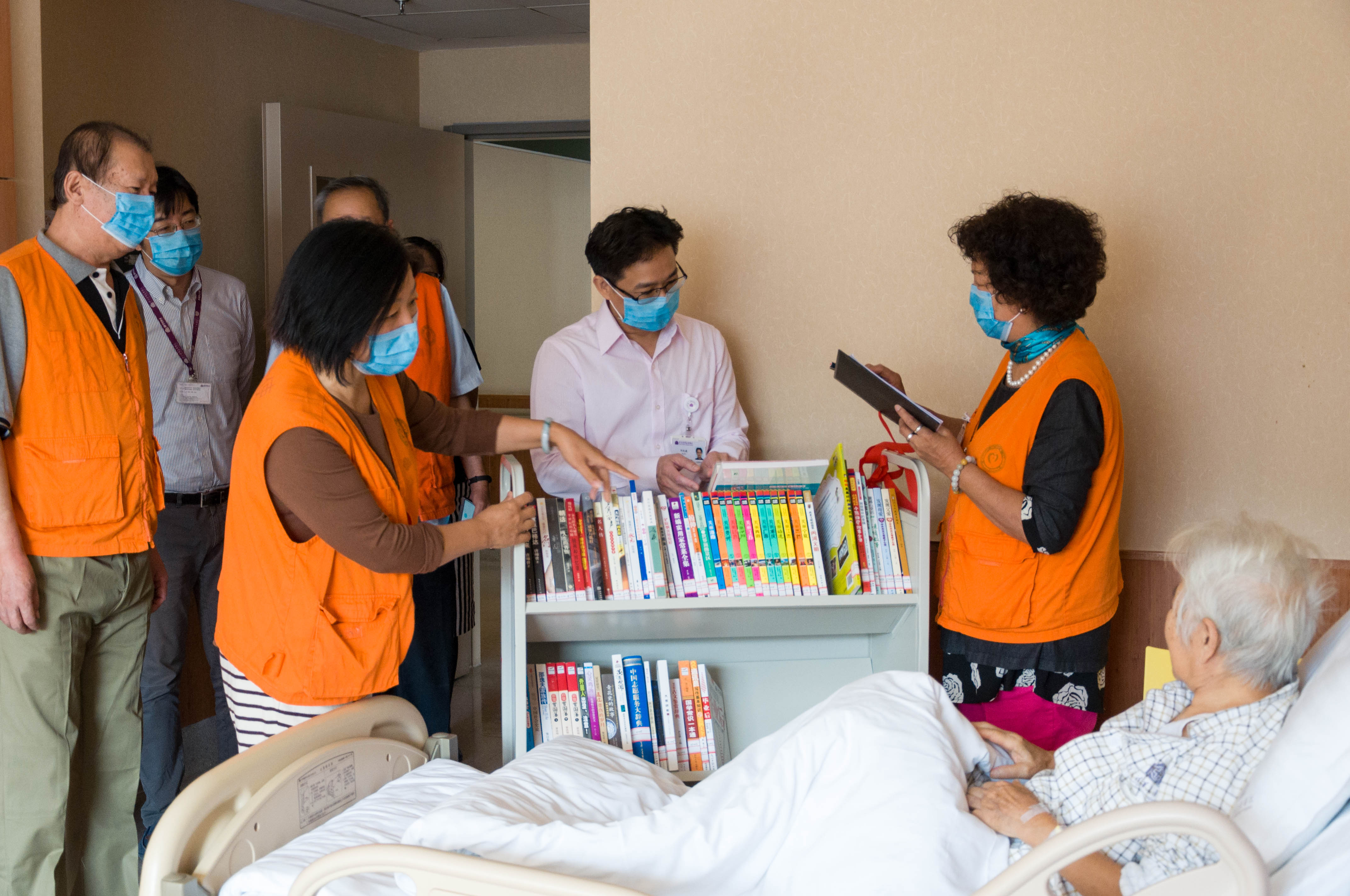 简单的启动仪式后,郭明和总执行长、何纪毅组长及张立东组长与志愿者一同推着手推车依次走访了10个病房,为数十名患者患者办理了图书登记与借阅服务。