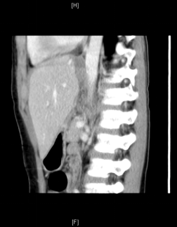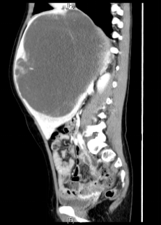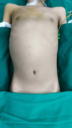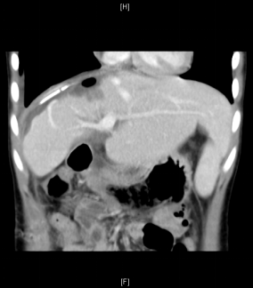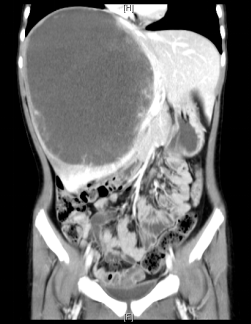 9岁10月女性,一月前因“纳差,巨大腹部包块”于河北医科大学第四医院行肝穿刺活检,并经北京儿童医院、北京协和医院、北京清华长庚医院病理会诊,确诊为“肝胚胎性肉瘤”。三周前,患者于河北医科大学第四医院行一疗程化疗(AVCP方案),肿瘤无明显改变,为求进一步治疗来我院。
