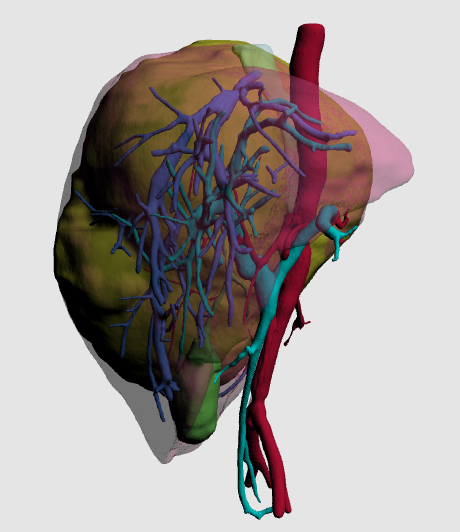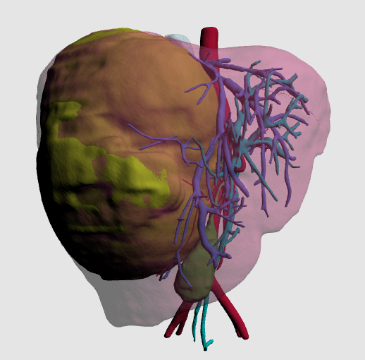 MDT讨论决定行肿瘤切除,术后行辅助化疗。手术难点:肿瘤巨大,侵犯、压迫大血管,解剖困难,术中出血风险高。对应策略:通过术前三维重建精确评估肿瘤与血管关系,制定手术计划。拟切除肿瘤所在的右半肝,剩余左半肝功能可代偿机体生理需要。