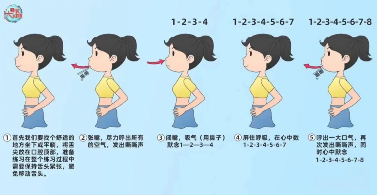 4-7-8呼吸:吸气4秒-憋气7秒-呼气8秒,重复4轮。有呼吸障碍、心脏疾病患者请咨询医生后谨慎尝试。