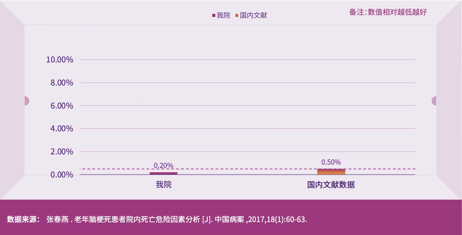 脑梗死住院死亡率是衡量救治危重症脑梗死的重要指标 , 国内文献报道数据 0.5%,我院2022年数据为 0.2%。