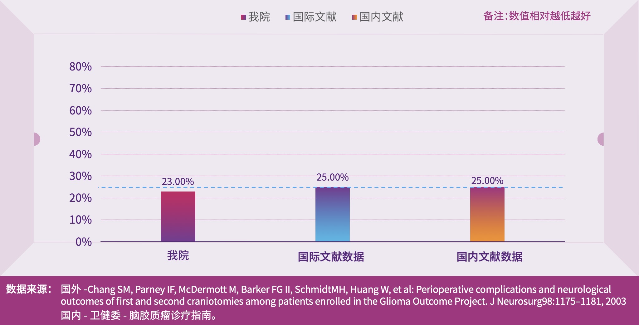 脑胶质瘤术后并发严重的神经功能缺损,如偏瘫、失语等,会影响病人的生存质量和预后,是影响病人生存期的独立预后因素之一。 脑胶质母细胞瘤术后严重神经功能并发症发生率能在一定程度上反映神经医学中心综合诊疗水平和医疗管理品质。我院胶质母细胞瘤术后严重功能并发症发生率 23%。