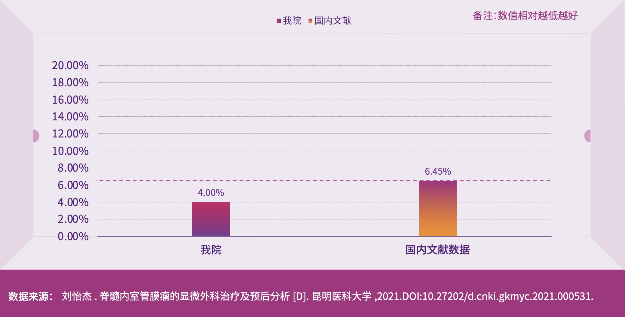 我院全切除率达 100%。脊髓室管膜瘤是最常见的脊髓髓内肿瘤,手术切除仍为首选治疗方案,因为大部分病理为偏良性肿瘤,所以手术的全切除率与手术成功与否、患者术后生活质量密切相关,同时也反应出了术者对于微创手术的深刻理解和手术技艺的精湛。
