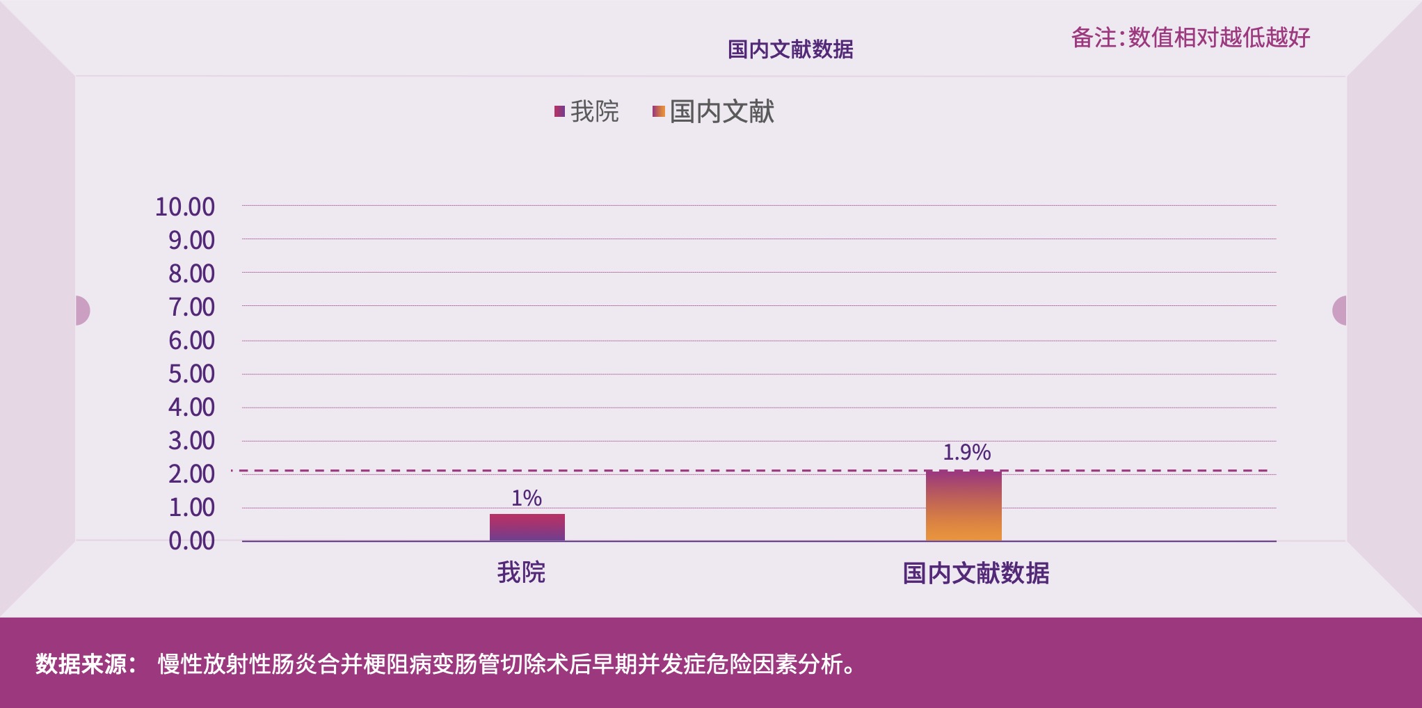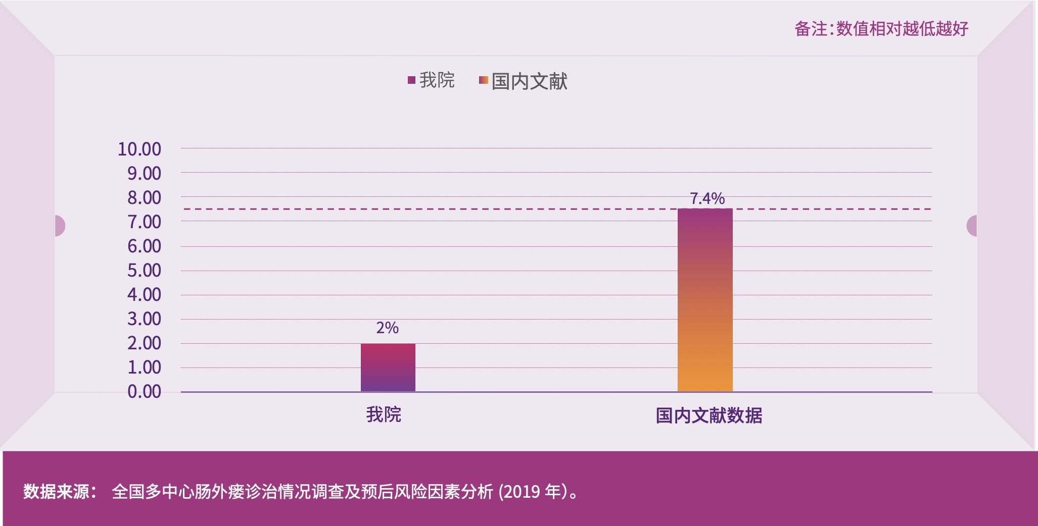 肠瘘是手术后最常见的并发症,也是危及患者生命的严重并发症。我院采用规范的、个性化的肠内+肠外营养支持治疗,通过各种途径放置黎氏双套管主动引流措施控制腹腔感染源,后期经过精准评估后行确定性手术治疗,熟练掌握治疗肠瘘的复杂技术,极大的改善肠外瘘患者预后。2022年我院肠瘘的住院死亡率控制在2%以内,远低于国内文献报道数据7.4%。