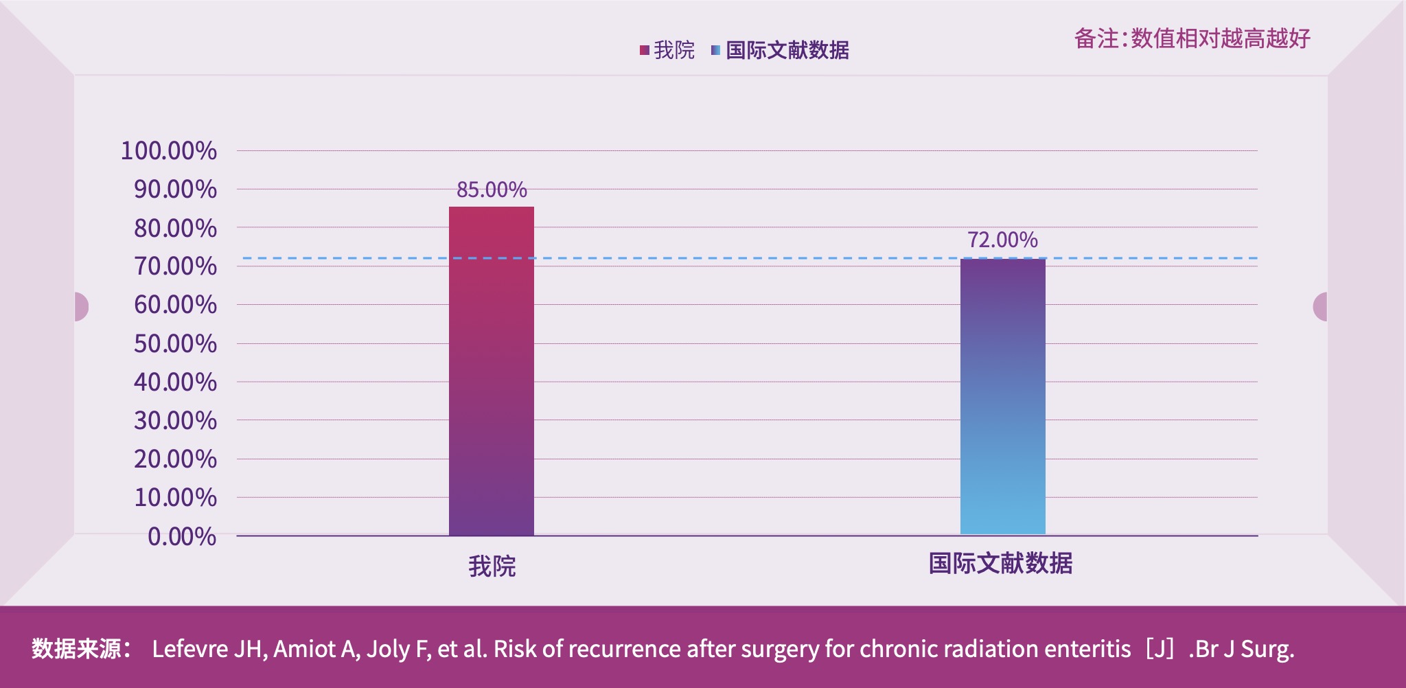 我院在慢性放射性肠损伤确定性手术诊治方面经验丰富,通过术前精准评估病变肠管,制定正确的手术策略,保证术后手术的顺利进行,包括应用腹腔镜、手术机器人等微创手段,减少患者创伤。2022年我院慢性放射性肠损伤的确定性手术的切除率维持在85%,高于国际文献报道数据72%。