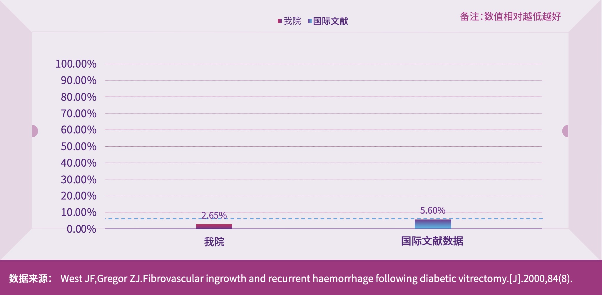 玻璃体切除术后1个月眼内再出血比例,评价术后再出血比例,反映手术有效性;2022年平均数据2.65%,国际文献报道数据5.6%。