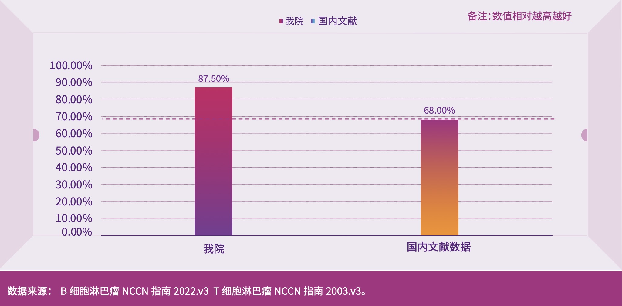 2022 年,共收治初治淋巴瘤 21 例,一线治疗 4 周期后达部分缓解比例为 87.5%(其中完全缓解比例为 69.4%),高于平均水平。