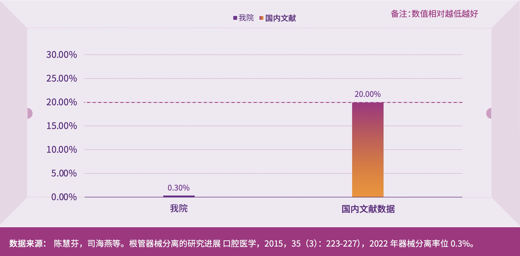 器械分离主要是指根管治疗过程中所使用的器械意外折断于根 管内或超出根尖孔,将阻碍根管治疗的顺利进行并可能影响疗效。 将器械分离发生率作为慢性牙髓炎根管治疗的质控指标之一,减少 根管治疗并发症。 我院器械分离发生率为 0.3%,国内文献报道数据 为 20%。