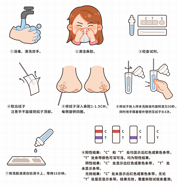 首先认真阅读说明书;然后,按照步骤及图示,进行鼻部采样;其次,采样拭子放在试剂盒配的小管中,滴加“样本处理液”,反复旋转并挤压拭子头;接着向试剂卡的加样孔滴加4-5滴样本处理液,等待15分钟观察结果,超过30分钟观察结果将是无效的。