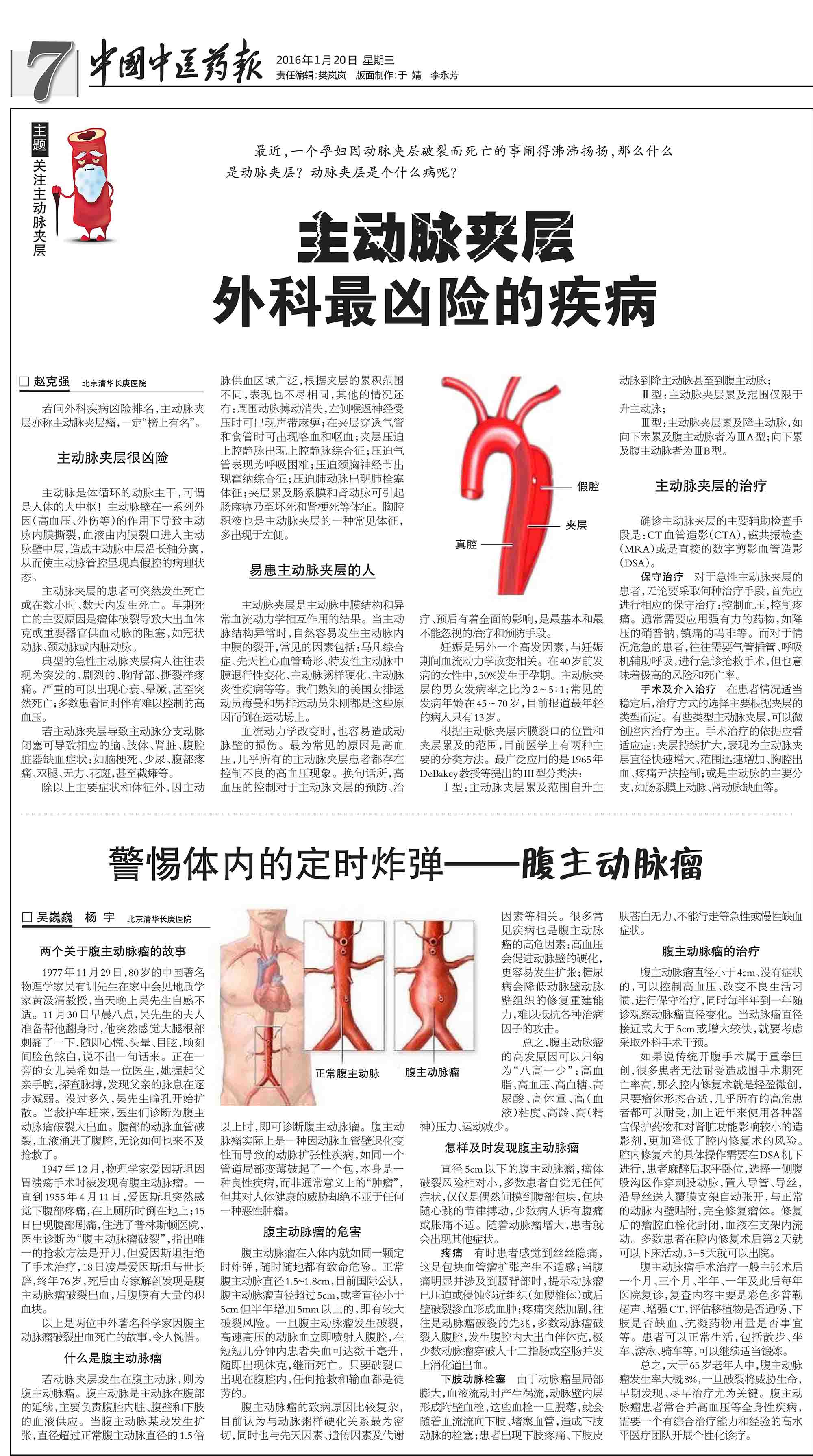 中国中医药报报道血管外科主动脉夹层、腹主动脉瘤科普文章