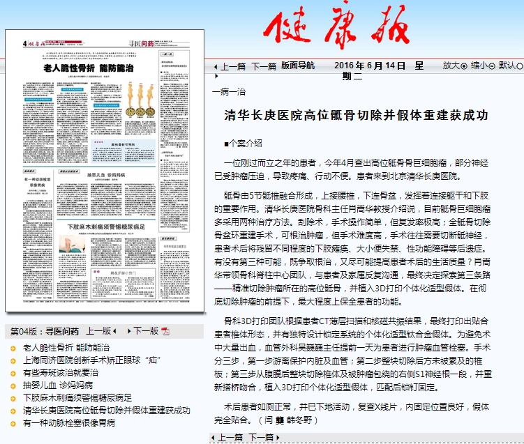 骶骨由5节骶椎融合形成,上接腰椎,下连骨盆,发挥着连接躯干和下肢的重要作用。清华长庚医院骨科主任肖嵩华教授介绍说,目前骶骨巨细胞瘤多采用两种治疗方法。刮除术,手术操作简单,但复发率极高;全骶骨切除骨盆环重建手术,可根治肿瘤,但手术难度高,手术往往需要切断骶神经,患者术后将残留不同程度的下肢瘫痪、大小便失禁、性功能障碍等后遗症。有没有第三种可能,既争取根治,又尽可能提高患者术后的生活质量?肖嵩华带领骨科脊柱中心团队,与患者及家属反复沟通,最终决定探索第三条路——精准切除肿瘤所在的高位骶骨,并植入3D打印个体化适型假体。在彻底切除肿瘤的前提下,最大程度上保全患者的功能。