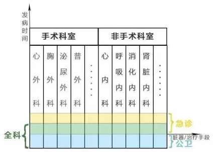 按照治疗手段,现在医院的科室一般分为手术科室、非手术科室,然后再按照脏器进行分科,前者包括心外科、胸外科、普外科等,后者含有心内科、呼吸内科、消化内科等。总体上来说,急诊医生承担的是病人从发病“零”时刻开始,到病情稳定或进入专科治疗的那段医疗任务;而全科医生是一部分综合医疗工作,再加健康保障(公共卫生服务)。如下图可以看出来急诊科与全科、专科的差别。
