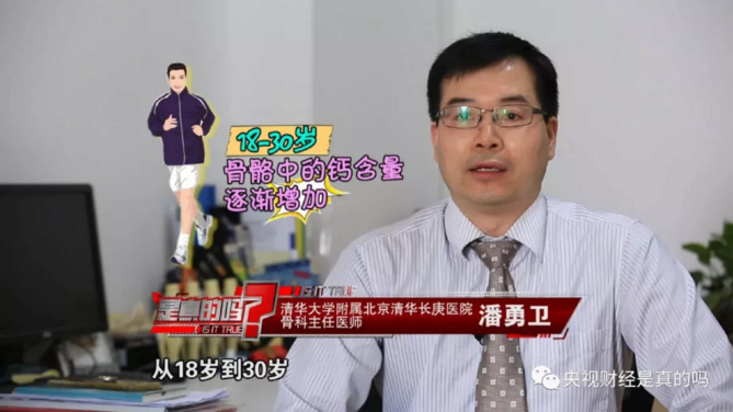 清华大学附属北京清华长庚医院骨科主任医师潘勇卫:“对一个健康的成年人来说,从18岁到30岁,骨骼里的钙的含量是逐渐增加的,到30岁以后就达到了一个顶峰,以后随着年龄的增长,只要维持正常的饮食和锻炼,这个钙的含量是可以维持的,但是对于一些特殊的人群,比如说小孩,孕妇,慢性疾病的患者,还有老年人,更年期的妇女,那么这些人单纯的饮食可能就不够了,要额外地补充钙和维生素D,同时要加强锻炼,多晒太阳,才能够满足身体对钙和维生素D的需求。”