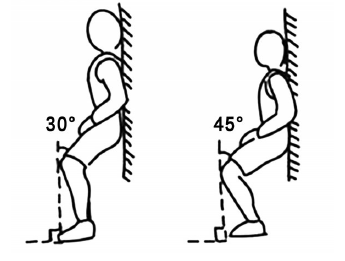 静蹲的姿势要求:站立,挺胸抬头,双脚与肩同宽,脚尖朝前,别内、外八字,既锻炼力量,又不增加髌股关节压力,慢慢蹲至30~45度(如图),静止到双膝酸胀,明显颤抖为止,再起身慢走放松。早、中、晚各1组,每组3次,每次间隔1分钟,练习时精力集中,自然放松。