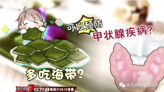清华大学附属北京清华长庚医院内分泌科主任医师肖建中:“我们一天的碘的需要量,大概是一百五十到两百个微克左右。我们刚才说这个海带的事情,一克的干海带,大概含碘就是要两百个微克,甚至比两百个微克还多一点。所以我们一天的生理需要量,只要一克干海带就可以了。如果你多吃的话,特别是说我们现在就做研究发现,如果碘摄入量太高的话,也是对甲状腺疾病是不利的,容易得甲亢,甚至容易得甲减,还有一些部分人,可能跟甲状腺肿有关系。所以我们说,多吃海带,可能是不能预防疾病,甚至还会带来一些问题。”