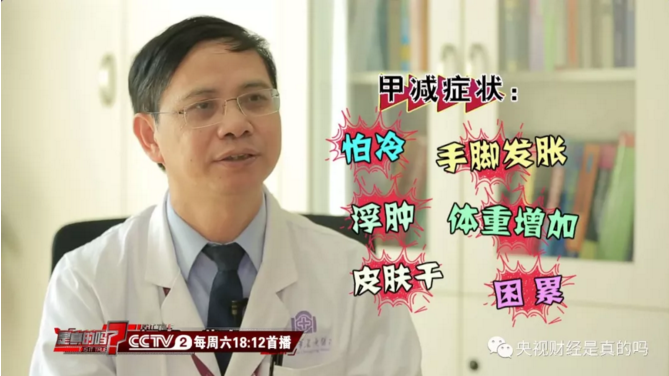 清华大学附属北京清华长庚医院内分泌科主任医师肖建中:“比如说,一般的都是有功能改变的时候,它才会出现一些症状。比如我们甲亢的病人,经常会出现,比如你吃的多、瘦、心慌、手抖、出汗多这样的一个情况,这是甲亢的一些表现。而甲减,它可能是会出现,比如一些怕冷、手脚发胀、就是有浮肿、体重增加、皮肤干,还有一些人,容易困、累,这样的一些表现,都可以是甲减的一些表现。”