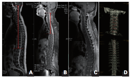MRI T2像显示肿瘤累及脑干和全部脊髓;B.增强扫描示肿瘤实体部分,强化明显,血供丰富;C.术后复查MRI示肿瘤 切除满意;D.术后CT复查提示所有椎板复位满意。