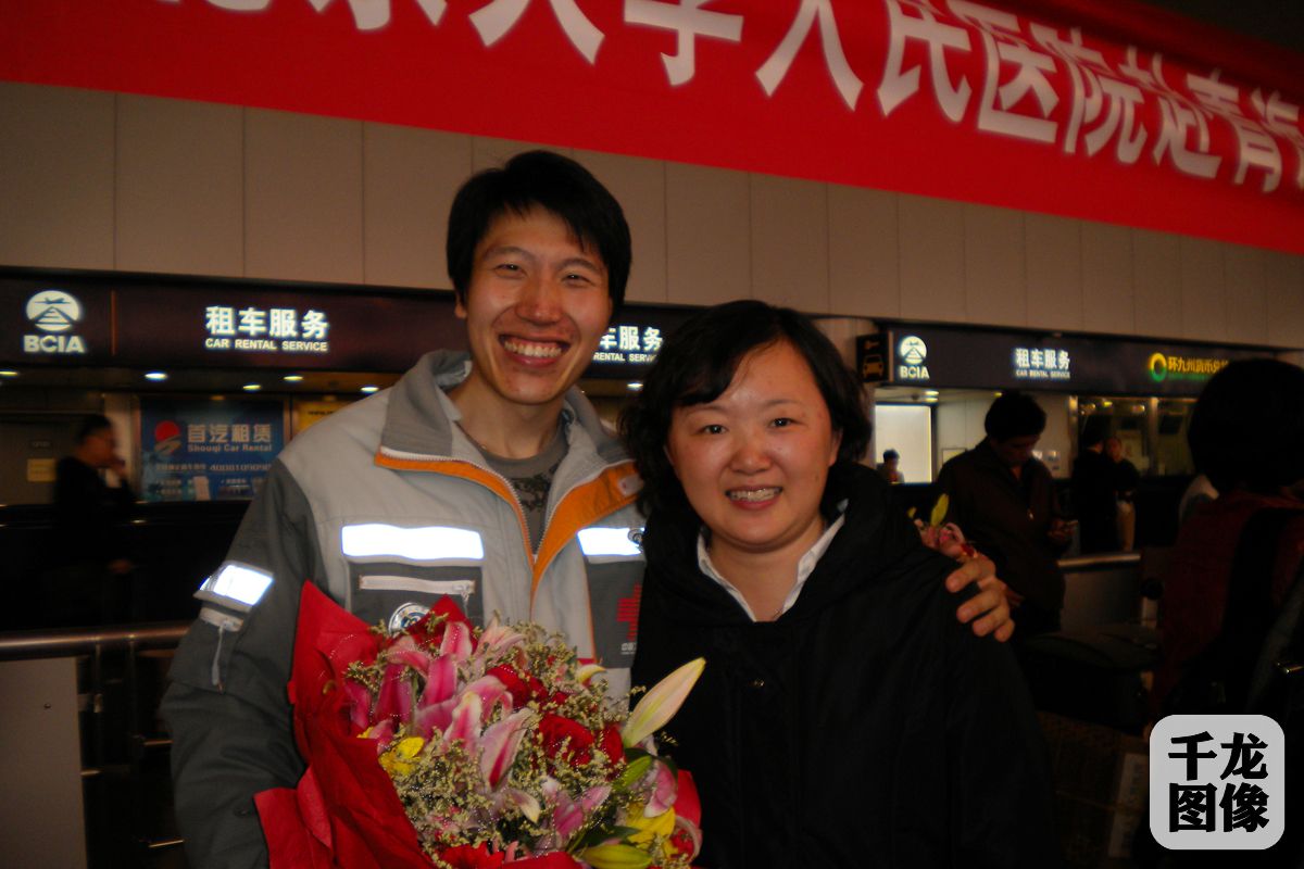 2010年4月26日,张振宇从玉树赈灾后返回北京,在首都机场与自己的博士生导师冯艺教授合影。 张振宇供图/千龙网发