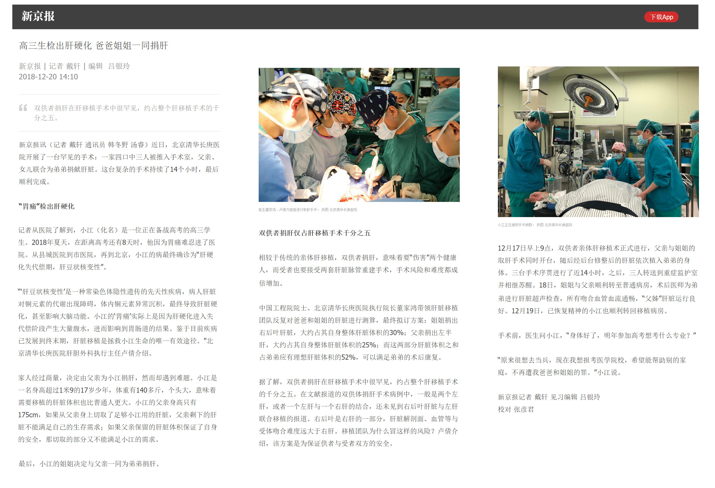 新京报讯(记者 戴轩 通讯员 韩冬野 汤睿)近日,北京清华长庚医院开展了一台罕见的手术:一家四口中三人被推入手术室,父亲、女儿联合为弟弟捐献肝脏。这台复杂的手术持续了14个小时,最后顺利完成。