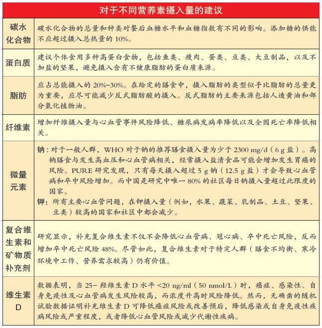 目前,多部营养指南均一致推荐低脂、高纤维饮食,增加蔬菜水果摄入量,控制能量摄入,维持健康体重。AHA 2020 战略规划也建立了降低冠心病的营养目标参数,同时强调保持能量平衡,并寻求与诸如类似地中海饮食、DASH( 一种控制高血压的饮食模式)饮食一致的膳食模式。