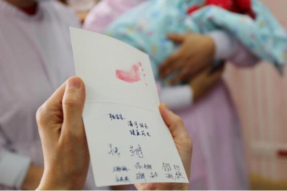 今天出院时,守护她一路走来的医护人员们既开心又有不舍,他们利用中午午休的时间,为“小苹果”办了一个简单的“满月庆”,唱着“亲亲我的宝贝”,医务工作者和“小苹果”的父母都落泪了。接生的医师、儿科所有的医护人员联合签名了祝福贺卡——“满月快乐,健康长大”。