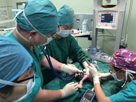 12月24日下午3点,接到产科的电话后,儿科李然、王月娇主治医师以及NICU护士长王皓月立即赶往手术室等候婴儿出生,从产科医生手中接到“小苹果”后,立即为她进行气管插管,气管内注入肺表面活性物质,生命体征刚刚平稳后,迅速用暖箱转运回NICU病房。