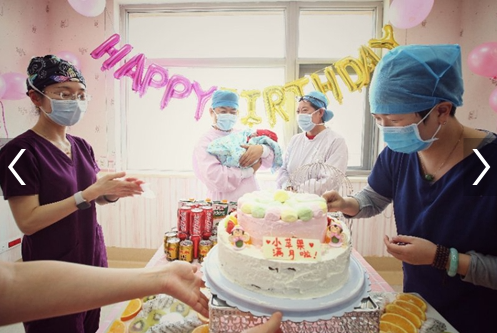 1月24日,是"小苹果"满月的日子,她也可以在这一天出院回家了,守护她一路走来的医护人员们既开心又有不舍,他们利用中午午休的时间,为"小苹果"办了一个简单的"满月庆"。简单的装饰后,NICU多了几分温馨,桌子上摆着一个蛋糕,可爱的"小苹果"穿着红扑扑衣服,带着红艳艳的帽子,躺在爸爸的怀里,被大家围在中间,接受着大家的祝福。