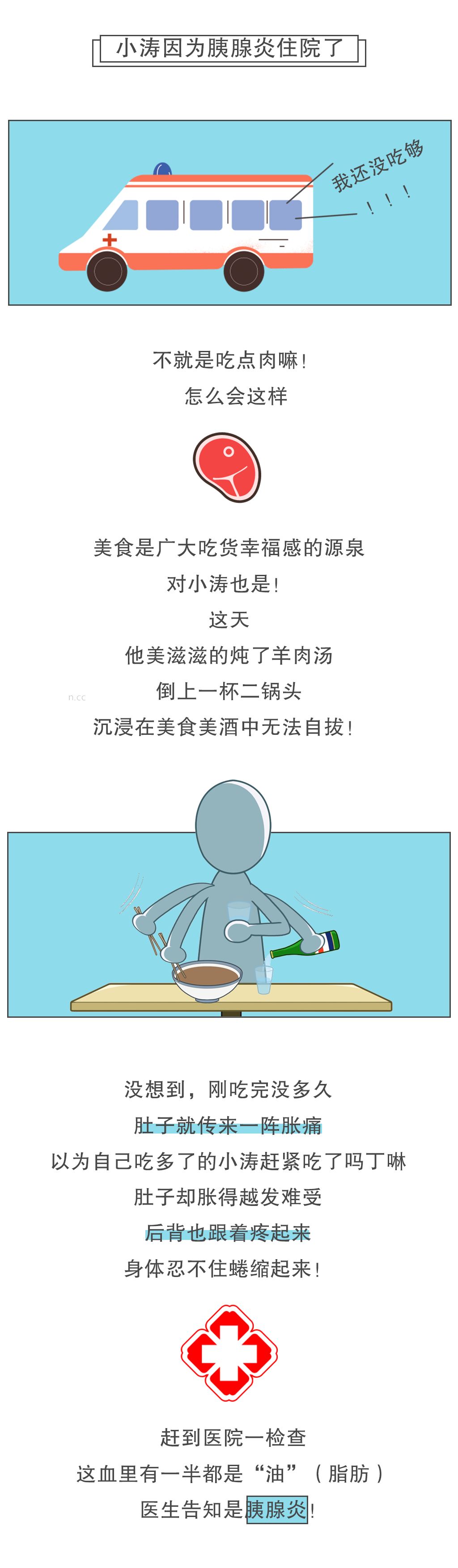 另一种是喝酒或者吃脂肪含量较高的食物,胰腺感受到强大的工作压力,努力超负荷生产“武器”,终于影响了防护装置的完整性,导致泄漏,引起胰腺炎,这也可能是让小涛患胰腺炎的凶手。