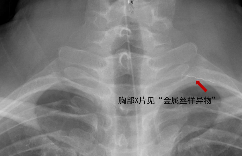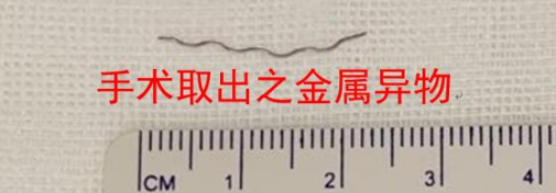 这种情况如不及时诊治,局部组织高度水肿,引起颈部感染,异物本身或感染倾犯颈部血管,导致动脉破溃出血,严重者可危及生命。于是,医生很快为石先生安排了颈侧切开异物取出术。手术中,果真从石先生左颈部的肌肉组织中取出了一根长约2厘米的螺旋状金属丝。