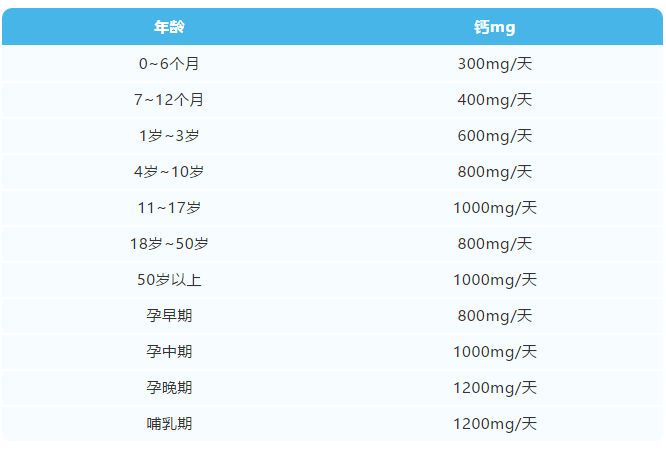 判断如何补钙效率高之前,还要看一看我们每天需要多少钙,不同年龄段的人是不一样的: