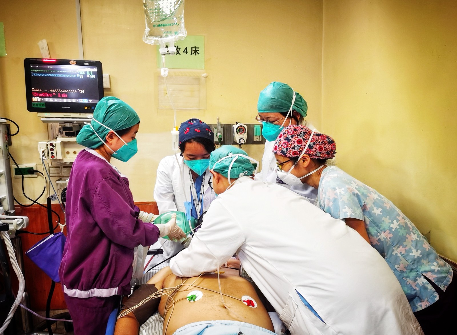 得立即暴露声门!可惜口腔太小了,只容得下喉镜,气管插管难以就位,婷姐也没能尝试成功。我的心提到了嗓子眼,一边捏着皮球人工呼吸维持氧合,一边做好气管切开准备,同时换个小号的气管插管,终于送到了声门旁,气囊也过了声门。终于成功了!对于困难气道,这真是值得庆幸的事情。随后,我从患者床头密密麻麻的管线缝隙中小心翼翼地钻出来,站起来,穿着粗气,发现自己全身都在颤抖。好在有惊无险。