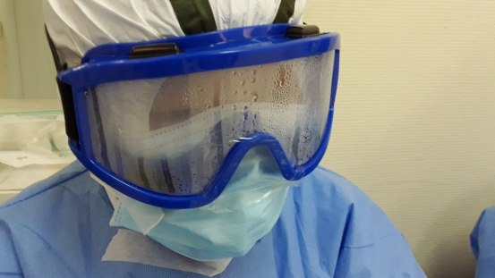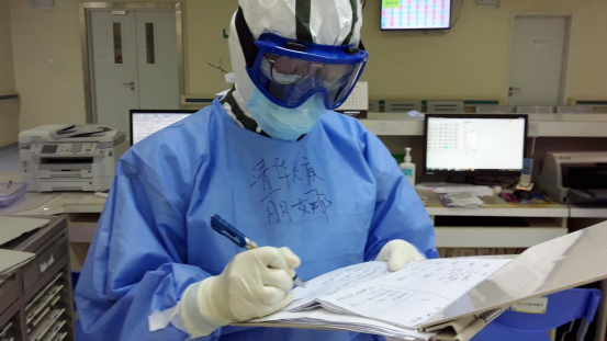 我们穿着几层厚厚的防护服在病房里穿梭,身上的汗湿了干,干了湿。每每帮病人翻身、换床单位后,都有种想摘掉口罩深吸一口气来缓解此刻的喘憋感。戴上护目镜严重影响了视线,在执行各种穿刺时就很困难,但是值得我得意的是不论是留置针、静脉采血、动脉采血,全部都是一针见成功。