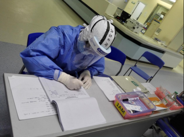 2020年1月30日下午15:00-21:00,这是下临床的第一个班次,14:30开始穿防护服,15:00进病房接班,刚开始内心还是有一些害怕和紧张的,经过一道道门后我们进入病区,可能因为第一天上班的缘故,交接班很乱,护士站也很嘈杂,但是在刘淑珍护士长的协调下,我们最终分成三个组来管病人,一个本院的护士带一个我们北京的护士,我和他们本院的李芸老师一起,因为第一天,老师对我很照顾,每次做操作都带着我进去,教我怎么使用呼叫铃,怎么使用新患者入院评估系统、医嘱处理系统,我们医院是责任制护理,自己的病人自己处理一切,武汉协和医院西院区他们有自己的主班老师专门负责医嘱,有药班老师专门配药,但是看不到医嘱,我心里没底,所以请老师教我他们的系统,老师很耐心,当然我感觉我也很聪明,教了一次就会了,嘿嘿。