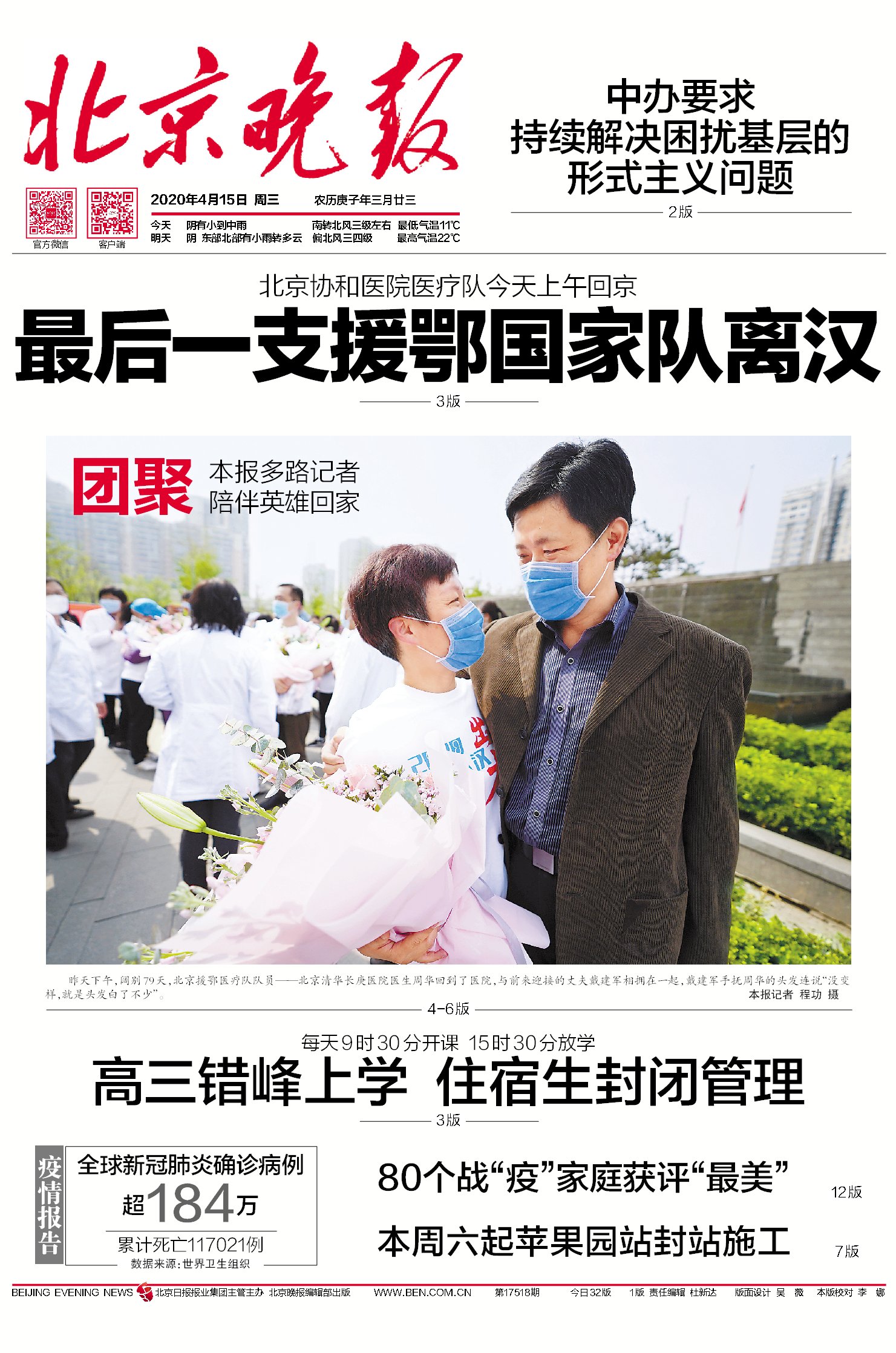 4月15日北京晚报头版报道我院支援武汉医疗队解封回家照片