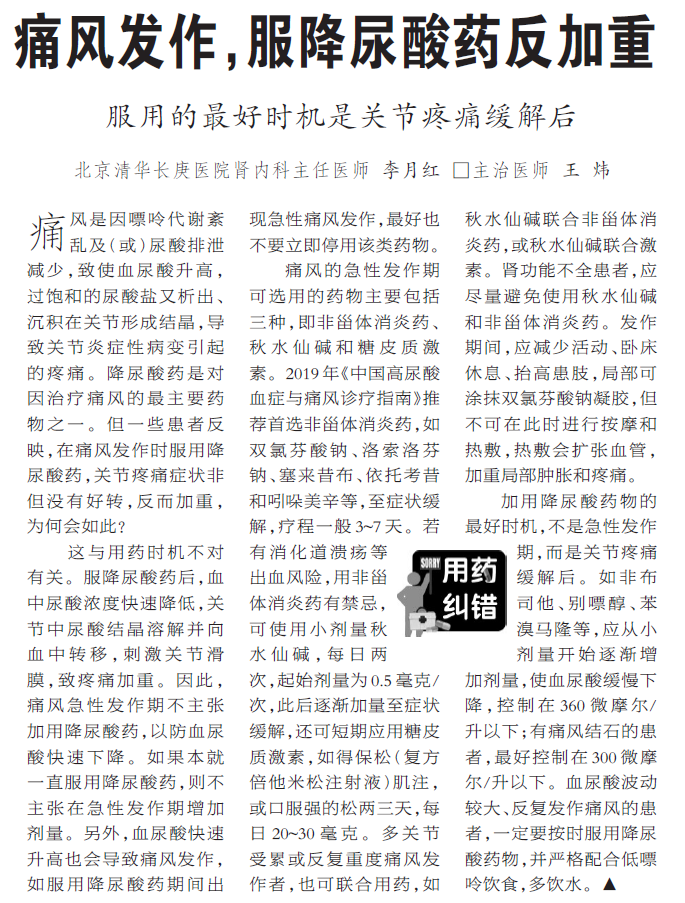 《生命时报》发表我院肾内科科普稿件:痛风发作,服降尿酸药物反加重 -服用的最好时机是关节疼痛缓解后