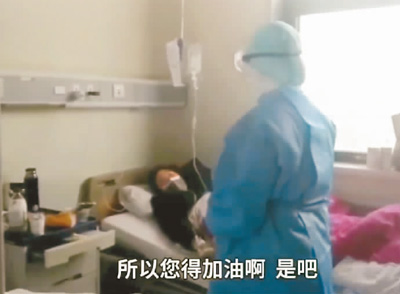 图为孙姝妍到172床大叔床旁告知有患者出院消息的视频截屏。