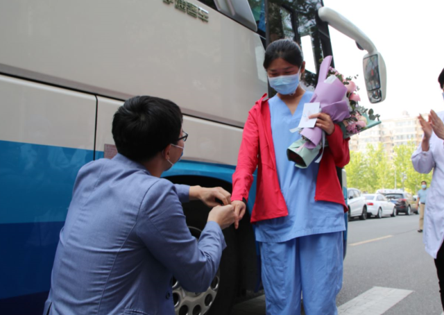 今天,小汤山定点医院的新冠肺炎患者清零,与此同时,北京清华长庚医院支援北京小汤山医院的57名白衣战士也终于隔离期满,迎来了回家的日子。就在大巴车抵达北京清华长庚医院时,现场发生了令人惊喜的一幕:医疗队队员、急诊科护士张磊的男朋友手捧鲜花、钻戒,单膝跪下向她求婚。
