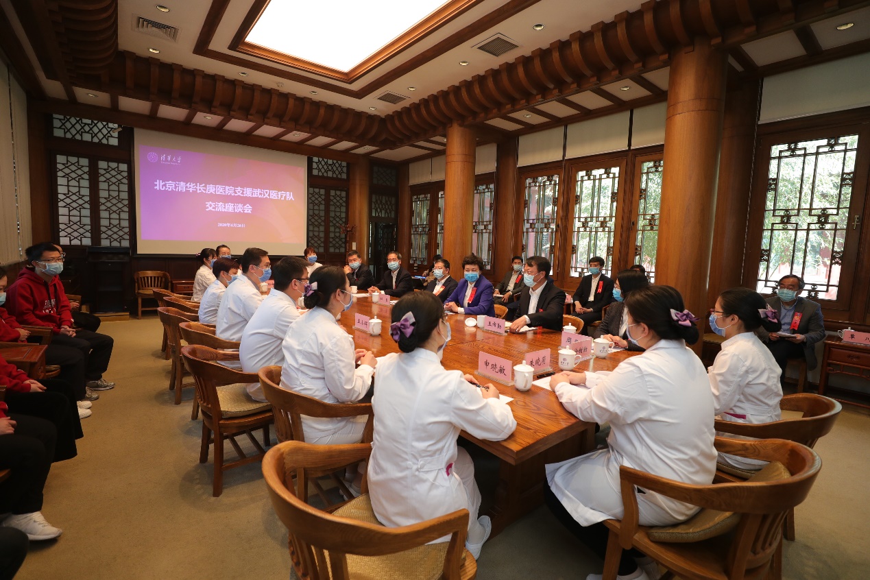 (记者 吕婷 摄影 李派)4月26日,清华大学迎来109岁生日。在这个特殊的日子里,学校在工字厅举行北京清华长庚医院支援武汉医疗队交流座谈会,邀请医疗队全体成员,交流战“疫”65天里的所见所感,分享属于2020年的一份特殊记忆。校长邱勇,校党委书记陈旭,校党委常务副书记姜胜耀,常务副校长王希勤,清华长庚医院院长董家鸿、院党委书记周月红等出席座谈会。王希勤主持座谈会。