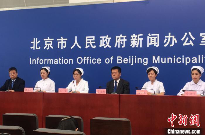 5月12日是国际护士节,北京市卫生健康委员会主任雷海潮(右三)及来自四家医院的护士出席当天举行的北京市新冠肺炎疫情防控工作新闻发布会。