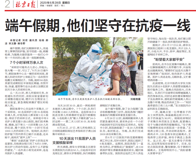 仅6月26日一晚,队员们便完成3000余份咽拭子采集。据统计,自6月17日以来,北京清华长庚医院已组织11批支援队共计225人次,分赴大兴、丰台、昌平、海淀区,支援咽拭子采样工作。(摘自北京日报客户端文章《这个端午假期,他们坚守在抗疫一线》)
