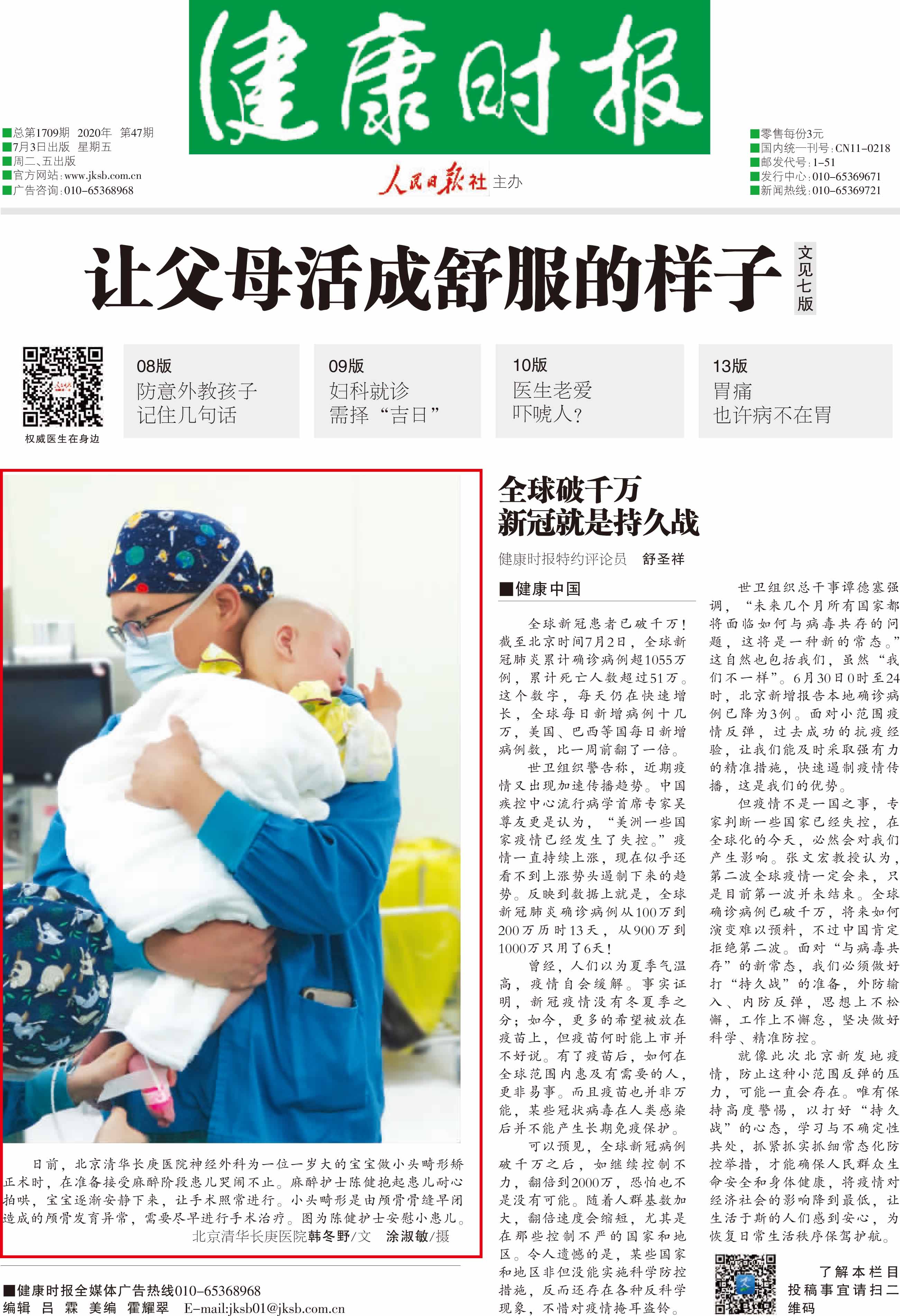 《健康时报》图片新闻报道清华长庚手术室护士陈健耐心拍哄一岁小患者