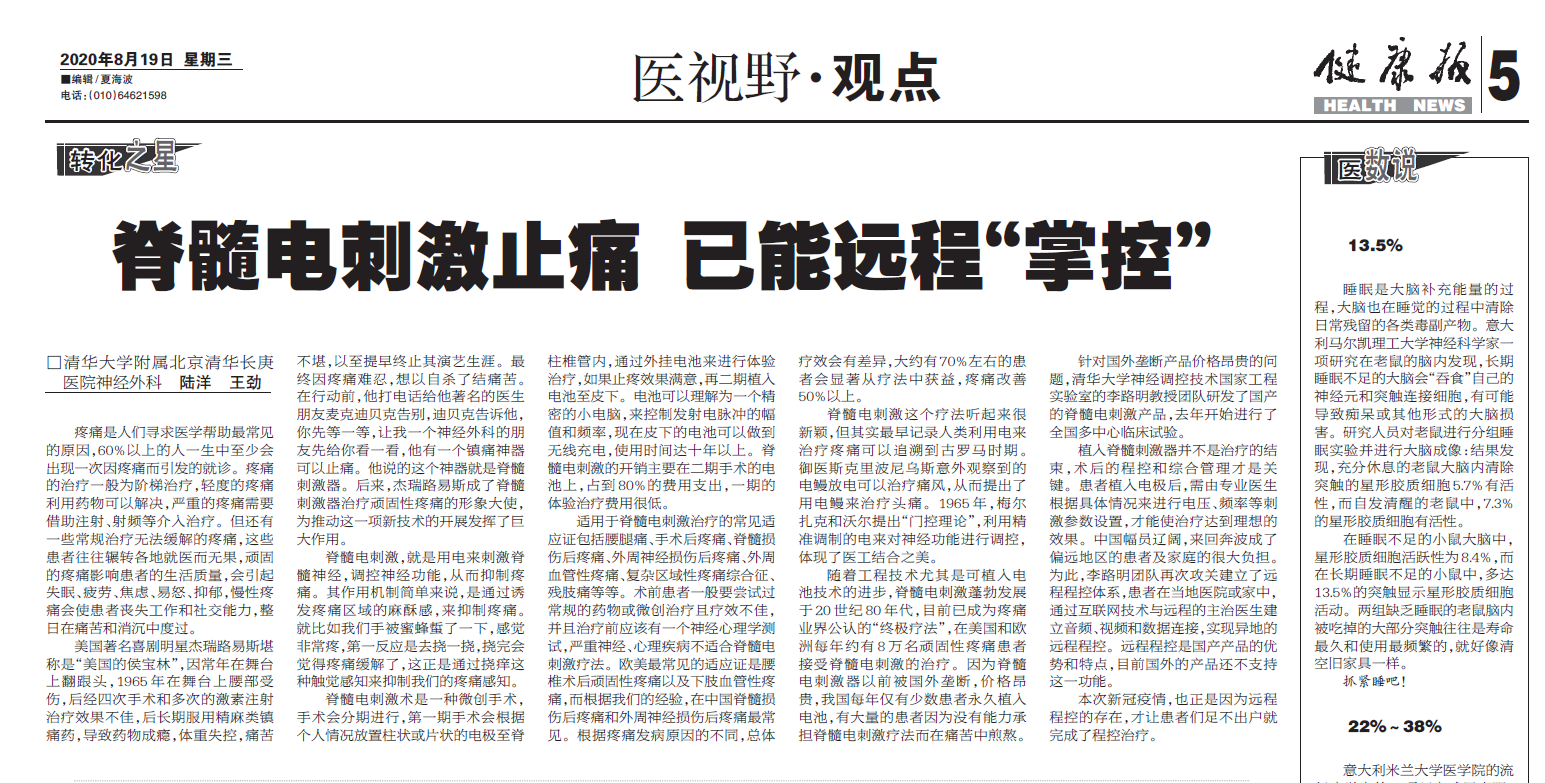 针对国外垄断产品价格昂贵的问题,清华大学神经调控技术国家工程实验室的李路明教授团队研发了国产的脊髓电刺激产品,去年开始进行了全国多中心临床试验。