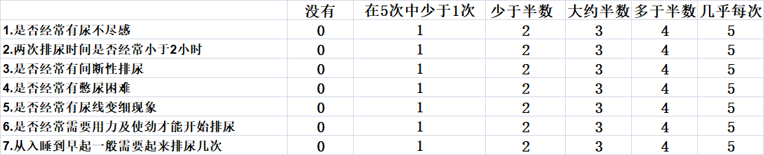 国际上对前列腺增生症状的轻重程度有一个主观性的评估量表,称之为国际前列腺症状评分表,简称IPSS。它由7个小问题组成,患者根据自己的情况如实回答,然后计算7个问题的答案对应的评分总和。评分标准是:0-7分为轻度,8-19分为中度,20-35分为重度。